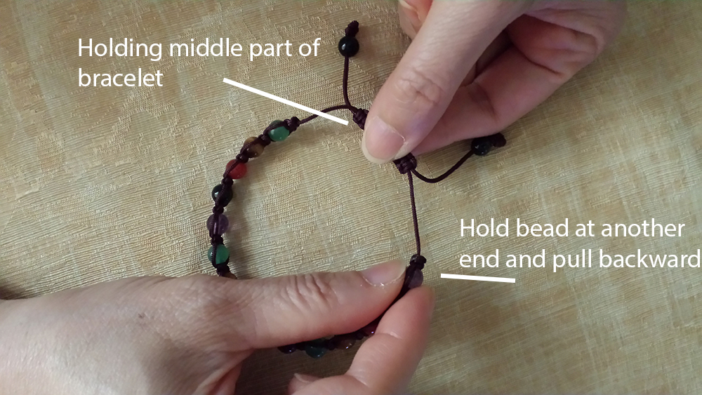 Now you want to wear the bracelet. So use one hand to hold the middle part of the bracelet, then another hand hold the last bead and pull the bead away from middle part.
