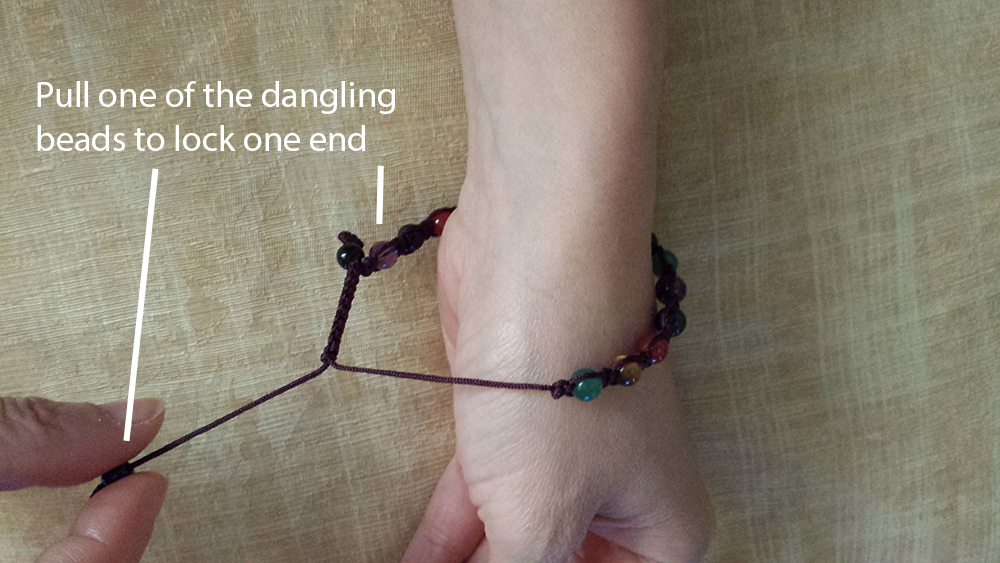 To close the bracelet, now, pull one of the dangling beads to lock at one end.
