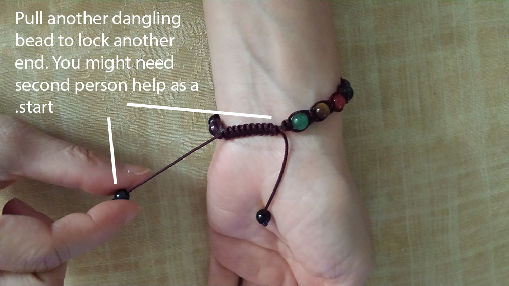 Repeat this action for another dangling bead to fully lock the bracelet and fit your wrist size. If this type of knot is new to you, you might need help from another person to complete these actions.
